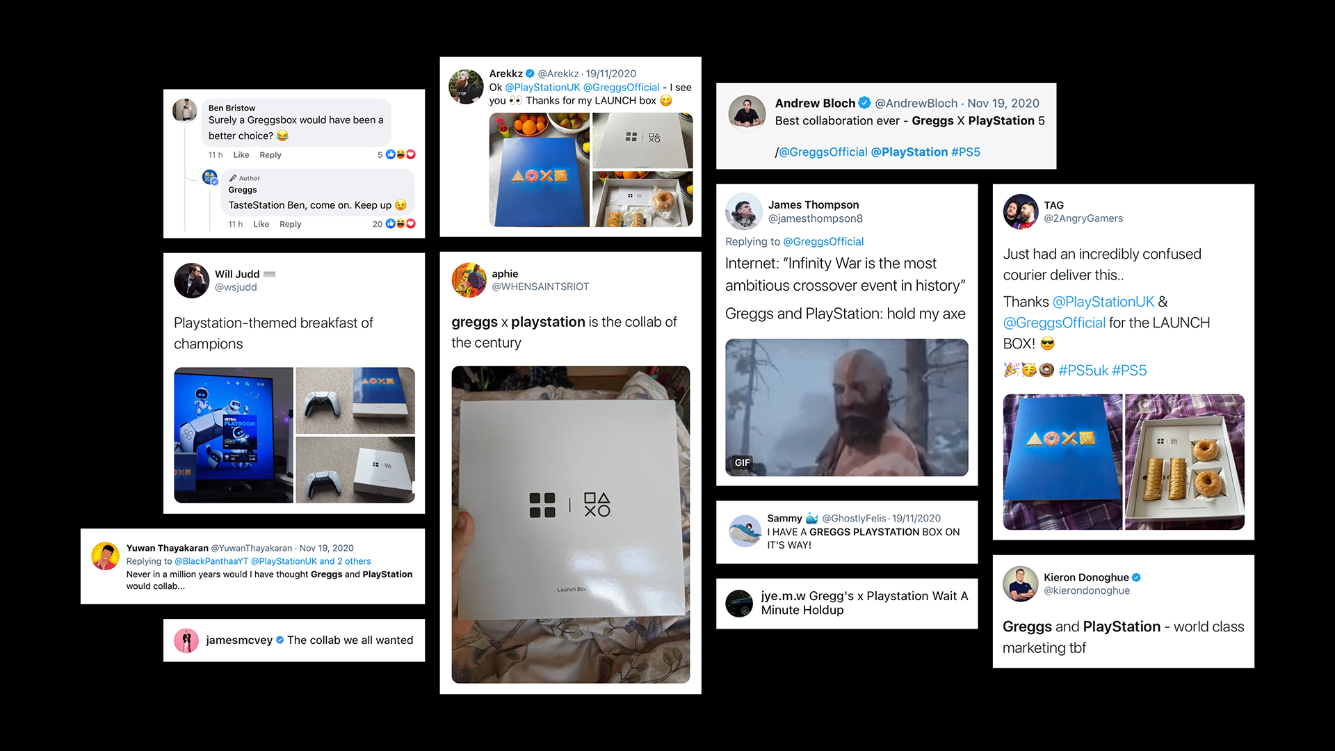 This built up to the launch of the Greggs | PlayStation Launch Box – a once-in-a-lifetime offer, consisting of four of the best-selling Greggs products, packaged in a luxury presentation box, complete with a dual branded sleeve that mirrored high-end console product packaging. Released on 19 November 2020, Greggs and PlayStation UK worked in unison to deliver ‘the other big launch of the year’.